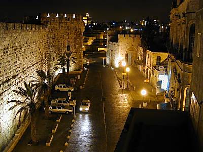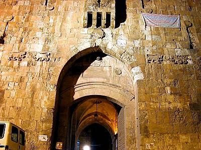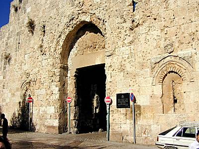 Portão de Damasco Chamado o Portão de Shechem pelos judeus, os árabes se lembram deste portão como o "Portão da Coluna" por causa do alto pilar que esteve na praça deste portão durante o período romano e bizantino. As escavações de Kenyon sob este portão turco encontraram sobras de um portal triplo-curvado que data ao tempo do Imperador romano Hadriano (135 A.D.). | ![]() |