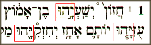 Confira na figura abaixo o Nome YAOHU como sufixo do nome do profeta Yaoshuayaohu (Isaías), além de ser sufixo também dos nomes de Uziyaohu (Uzias) e 'Khizkiyaohu (Ezequias), no capítulo 1 verso 1 do livro daquele profeta: